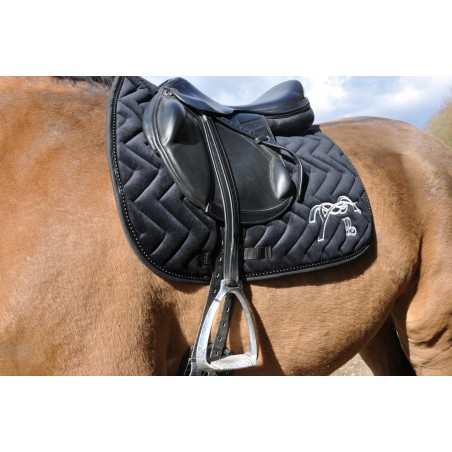 Toujours cette silhouette so chic des tapis de selle Pénélope Collections mais cette année, disponible dans un velours très doux, très classe et savoureusement vintage. On retrouve la même belle découpe de dos qui permet de bien dégarrotter, deux passants de sangle pour un maximum de stabilité et une doublure noire, peu salissante. Tout autour, un galon noir et un Point sellier verni noir apporte cette touche Pénélope reconnaissable entre mille. Côté broderie, à gauche, on trouve le logo Pénélope en contraste et à gauche, le blason avec le monogramme PL à l'intérieur. Enfin, notre tapis Point Sellier en velours est fabriqué en France dans notre atelier.