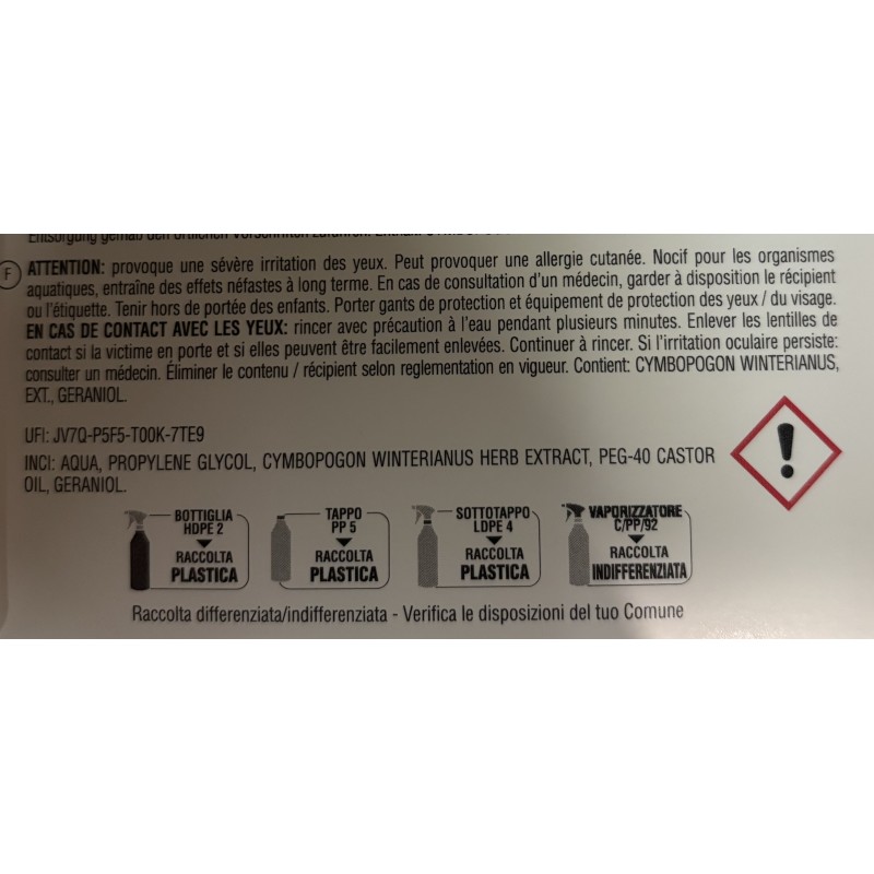 Solution à vaporiser, hypoallergénique aux propriétés protectives, à base de citronnelle et géranium. Une protection efficace à base d’huiles essentielles et d’extraits de plantes. Les propriétés reconnues de la citronnelle et du géranium créent un réel écran de protection sur le poil du cheval. La formule équilibrée permet une utilisation fréquente jusqu’à plusieurs fois par jour afin de renouveler la protection. La CITRONNELLE, le GERANIUM et le CANNELLE sont des plantes communément utilisées pour éloigner les insectes