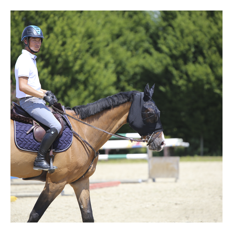Notre très populaire masque anti-mouche Fly Mask Slim Fit est composé de lycra pour assurer un ajustement parfait et un confort optimal. Extrêmement respirant et durable, le masque est fabriqué de manière à opérer comme une seconde peau de façon à éviter que les insectes ne rentrent sous le masque. La maille au niveau des yeux est robuste et évite toute irritation car elle n’est pas en contact avec la tête du cheval. Lorsqu’elle s’écrase par une action du cheval, elle retourne à sa forme initiale toute seule. Le masque comporte une fermeture à éclair et un bouton pression ainsi qu’une ouverture au niveau du toupet et est spécialement conçu pour être lavé à la machine à 30° (pas de sèche-linge).