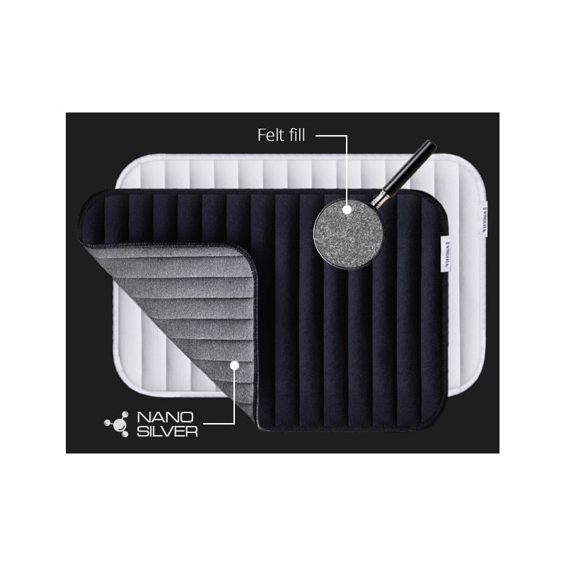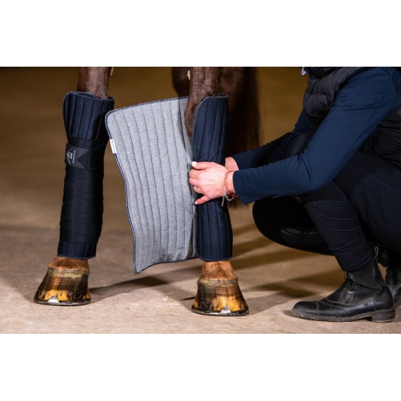 La structure inédite de la matière et la combinaison avec une couche en feutre garantit une évacuation efficace de la transpiration et de l’humidité vers l'extérieur. Les ions d’argent contribuent à réduire les odeurs désagréables et permettent aux sous-bandes de rester fraîches plus longtemps. Leur structure multi-couches offre en outre une protection efficace contre les chocs sur toute la surface et protège ainsi les jambes de votre cheval durant l’entraînement.