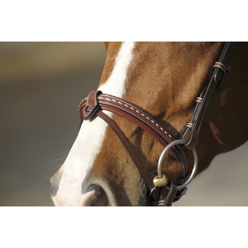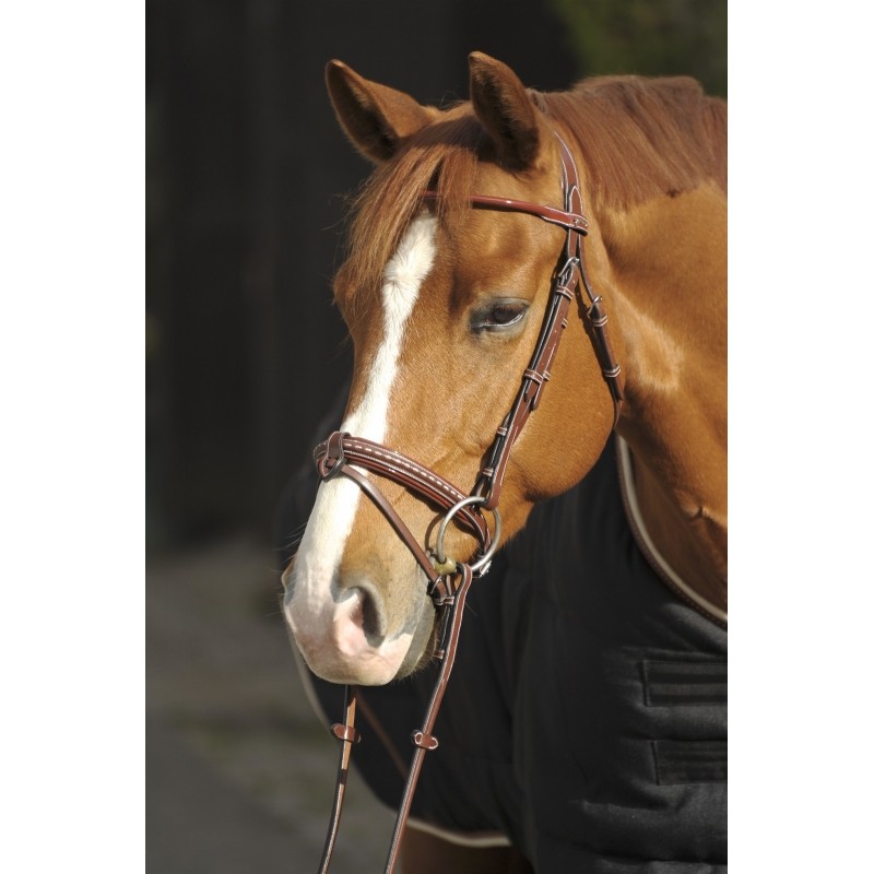 Très beau bridon en cuir haut de gamme très souple. Doté d'une muserolle combinée rehaussée d'un point sellier en contraste, le frontal est rond, verni & ton sur ton. Une têtière élargie permet une augmentation du confort et une répartition de la pression sur la nuque du cheval. Le bridon est accompagné d'une paire de rênes en cuir et caoutchouc avec picots antidérapants.
