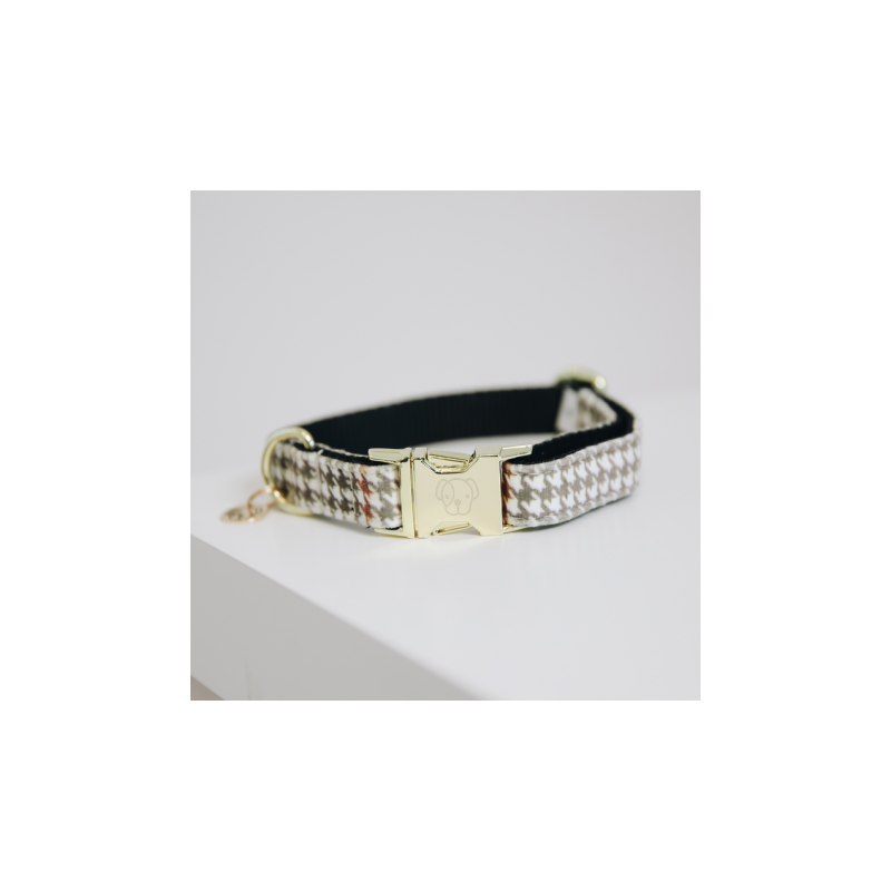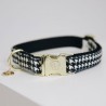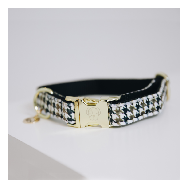 Graphique et chic la fois, le motif pied-de-poule s'accorde parfaitement avec nos colliers pour chien.