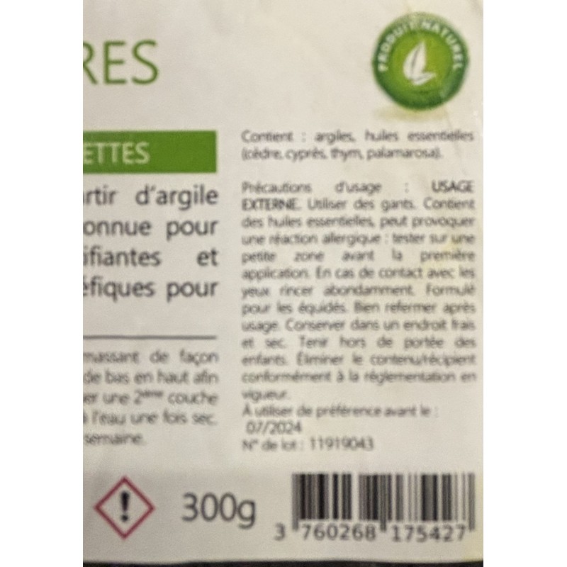 Conseils d'utilisation : Appliquer en massant de façon circulaire sur les zones à taiter puis de bas en haut afin d’activer la circulation sanguine. Appliquer une 2ème couche plus épaisse et laisser sécher. Rincer à l’eau une fois sec. Recommencer l’opération 2 à 3 fois / semaine.