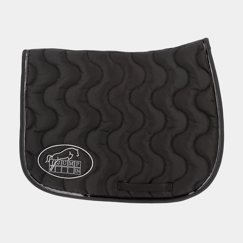 Tapis de selle Jump'In noir, galon verni noir et bordure noire avec un intérieur nid d'abeille pour une meilleur absorption de la transpiration. Il est orné d'un logo Jump'In verni assorti au tapis.