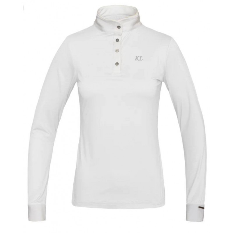 Chemise de concours à manches longues pour femmes en matière technique légère. Col, patte et poignets tissés. Boutons en métal avec logo et cristaux sur la patte et le poignet. Plaque métallique avec logo sur la manchette. Logo brodé sur la poitrine et à l'arrière du col.