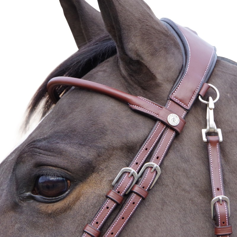 Muserolle Pull Back : une meilleure répartition des points d’appuis pour le confort de votre cheval ! Frontal rond, muserolle pull back plate et dotée d’une large doublure. Têtière anatomique extra large doublée et estampée F&C. Sous-gorge avec mousquetons de chaque côté et boucle de réglage. Bouclerie inox gravée F&C. Livré avec rênes caoutchouc eventer.