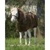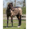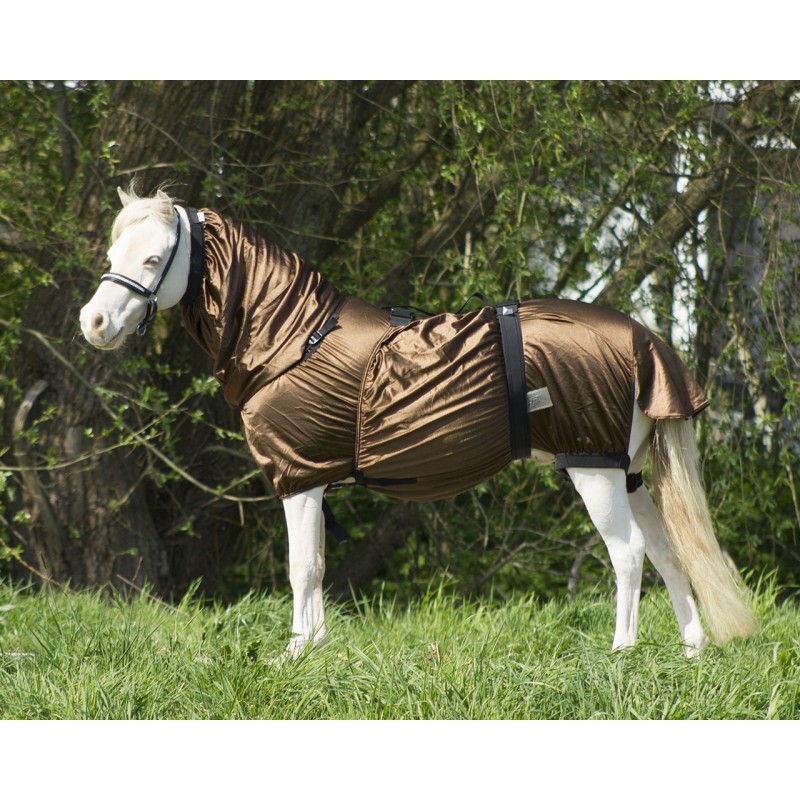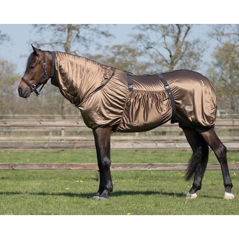 Cette couverture anti-eczéma est muni d'un couvre-cou attachée avec fermeture élastique, d'un large rabat sur le ventre avec des sur-sangles élastiques réglables et d'un large rabat de queue. La science a prouvé qu'un motif zébré a un effet dissuasif sur les mouches parce que les rayures réfléchissent la lumière. Cette réflexion irrite les insectes.
