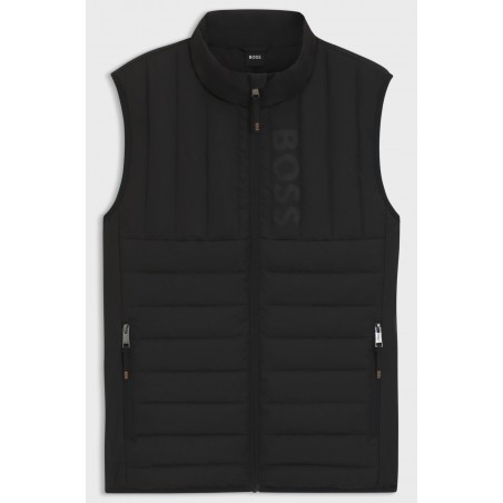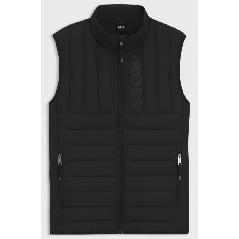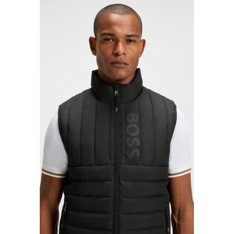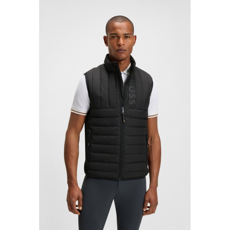 Avec un matelassage raffiné et un imprimé logo vertical, cette veste sans manches BOSS Homme légère offre un confort thermique au niveau du buste. Respirante et imperméable. Patch logo au dos.