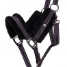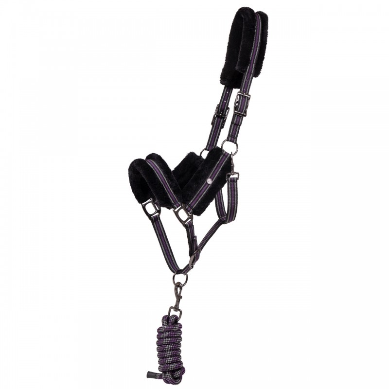 Le licol Fayen est rembourré avec de la fausse fourrure douce au niveau de la têtière, de la muserolle et des joues. Ce licol chic présente des détails violets et scintillants. Cet ensemble fait partie de la collection Fayen.