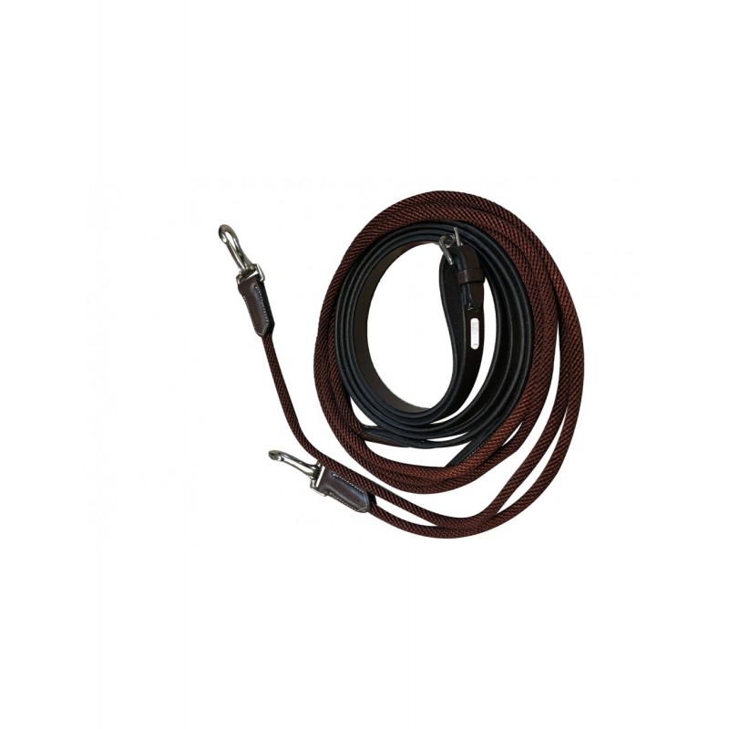 Les rênes allemandes de la Collection One par Jump'in sont composées d'une partie en nylon rond et d'un cuir plat. Aux extrémités, on trouve deux mousqueton en inox pour une fixation facile.