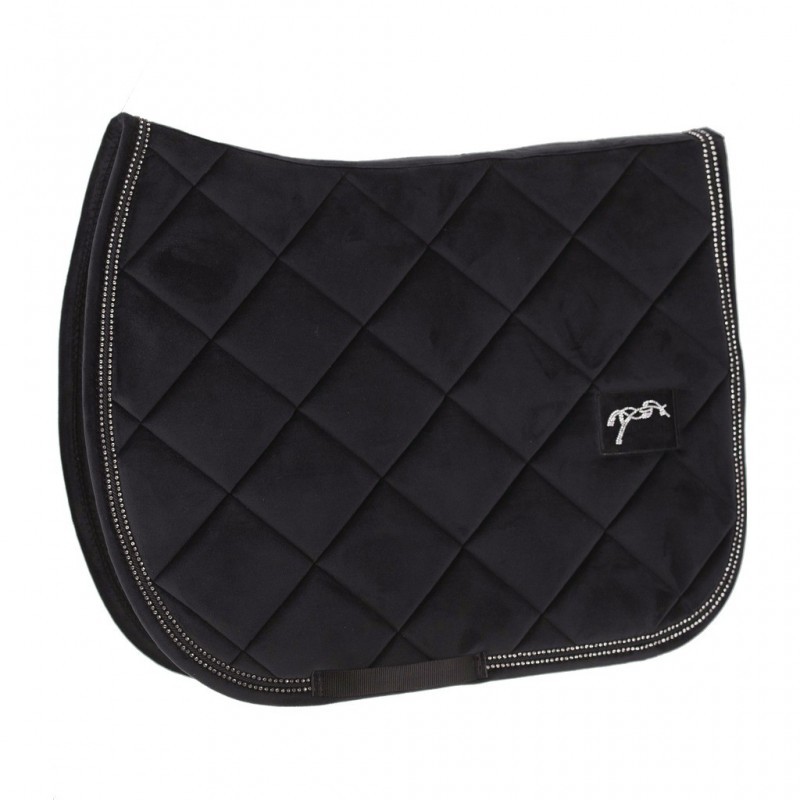 Tapis PENELOPE New Strass matelassé en losange et ornée d'un galon et du logo Pénélope, le tout, en strass. Sa ligne de dos est bien dégarotté et il est doté d'un passant de sangle de chaque côté. En marine et noir, les tapis New Strass s'accordent parfaitement avec les bonnets assortis de la même collection. Les tapis et bonnets New Strass constituent des looks parfaits pour les concours hippiques.