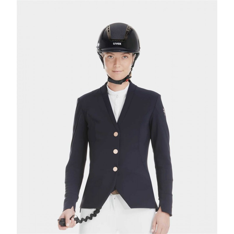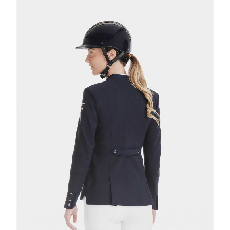 La veste Aerotech résume en une réalisation toute notre approche du vêtement d’équitation. Nous avons repensé la veste de concours, plus ergonomique et plus technique, sans sacrifier ses lignes intemporelles. Pour améliorer la liberté de mouvement, la matière employée est souple et élastique tout en conservant une bonne tenue pour garantir le tombé d’une veste de concours. Nous avons aussi travaillé sur un patronage et des découpes ergonomiques, pour une veste technique et préformée qui s'adapte parfaitement à la posture du cavalier en compétition. En plus des qualités respirantes de la matière, des perforations laser stratégiquement placées dans le dos et sous les bras améliorent l’évacuation de la chaleur. Le résultat, une veste conçue pour la performance qui s'oublie dans l’effort.