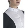 Devant de bavoir blanc détaillé, plis en épingle, forme de sablier qui met en valeur n'importe quelle silhouette, boutons fantaisie sur le col, broderie avec logo, motif italien et tissu contrasté, pour souligner le style de la mode.