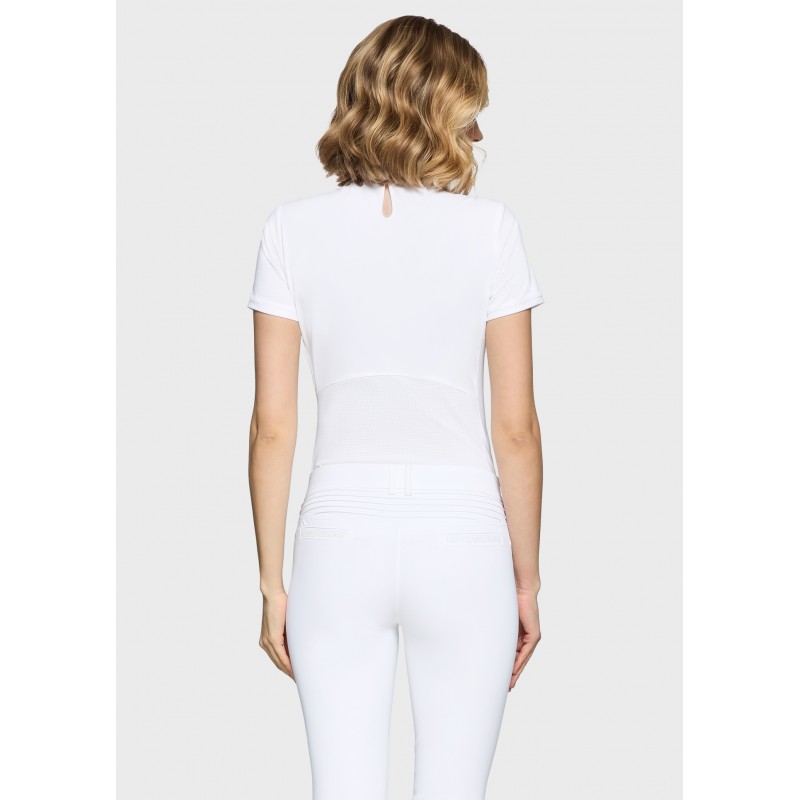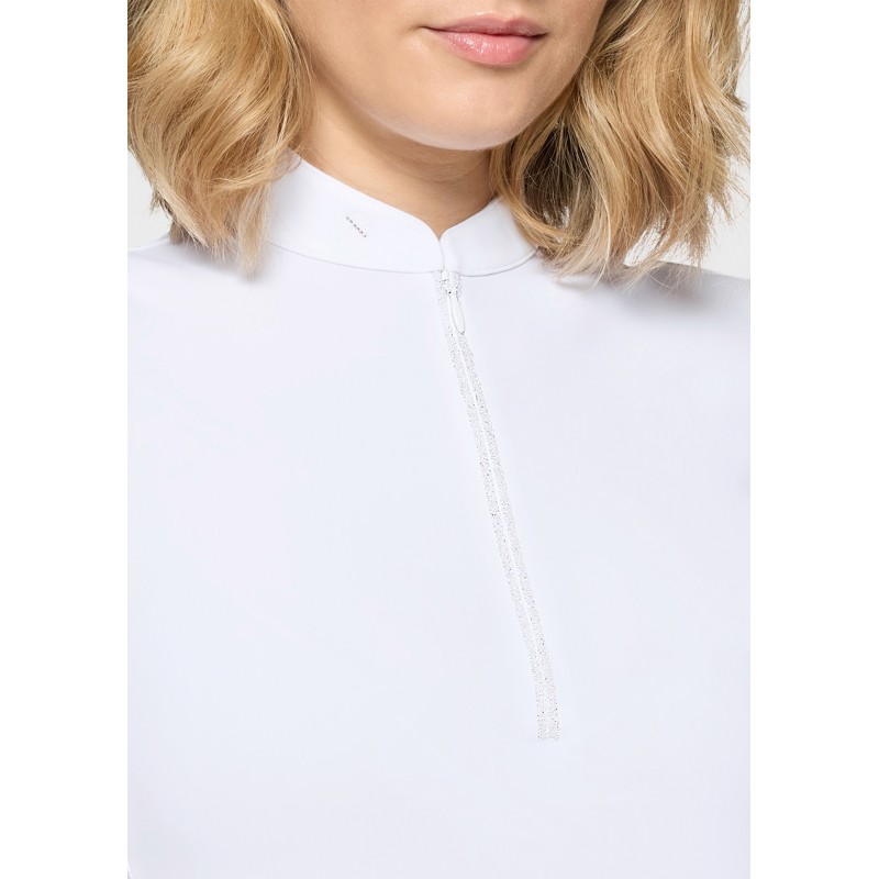 Confectionné dans un tissu italien respirant et stretch, Aloise assure un confort durable et une liberté de mouvement totale, même dans l’effort. Les zones perforées au bas du dos et sur les manches favorisent une ventilation ciblée, idéale en concours. La découpe goutte d’eau au col, soulignée par un blason Swarovski, signe une féminité subtile, tandis que le demi-zip invisible orné de Crystal Fabric ajoute une touche précieuse et maîtrisée.