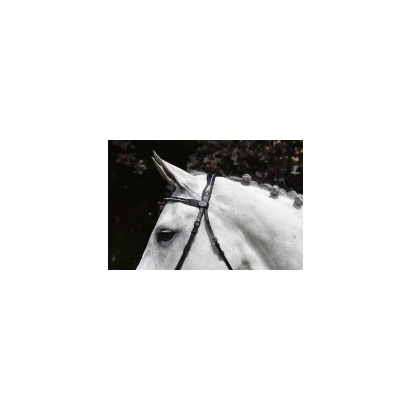 Le bridon Crystal est un véritable bijoux de briderie avec ses incrustations rondes ton sur ton en Crystal Fabric de Swarovski sur le frontal, la muserolle et la têtière. La têtière élargie est anatomique et la muserolle, uniquement disponible en combinée. C'est un bridon qui se prête à une utilisation en concours hippique, pour de belles occasions. La bouclerie est en inox et les rênes en caoutchouc bien souple.
