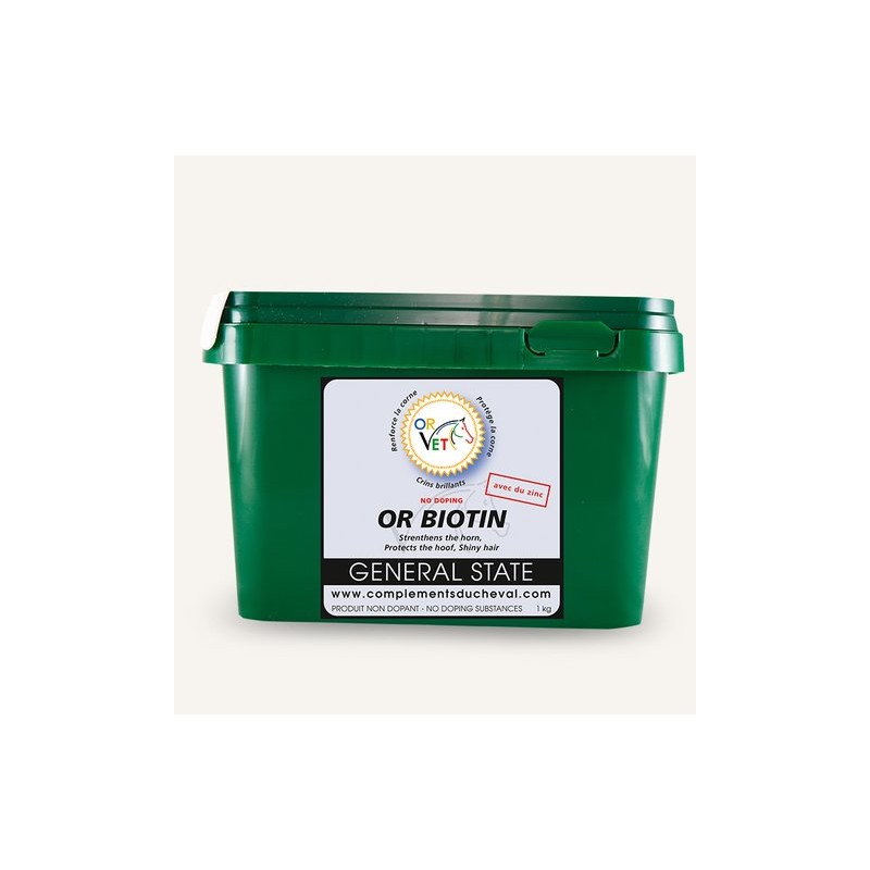 OR BIOTIN est un aliment complémentaire pour les chevaux qui apporte un soutien indispensable pour la qualité de la corne des sabots de votre cheval. Il favorise leur consistance, leur croissance et leur bonne santé. OR BIOTIN apporte brillance et santé à la robe et aux crins de votre cheval. OR BIOTIN contient de la biotine associée avec de la vitamine E6 (Zinc) qui est un composant essentiel des cellules constituant l'organisme du cheval.
