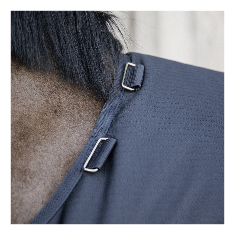 La couverture d’extérieur classic 300g est fabriquée à partir d'un extérieur en polyester ripstop 600D avec un revêtement imperméable respirant. Cette structure rend la couverture très résistante aux déchirures. La doublure de la couverture est un polyester 210T lisse et antibactérien. Cette doublure est facile à entretenir car elle ne sent pas et les poils ne s'y attachent pas. Le remplissage est fait de fibres PES. Le remplissage en fibres a les mêmes performances que le duvet, et crée donc une couche isolante autour de votre cheval. La combinaison de ces matériaux permet à votre cheval de rester au sec par tous les temps.