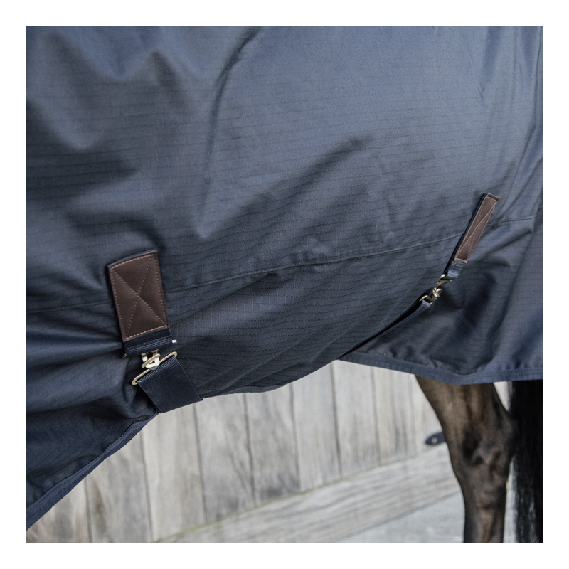 La classique imperméable n'a pas de couture à l'arrière de la couverture, ce qui évite le risque de fuite. Pour plus de chaleur, vous pouvez utiliser cette couverture avec une sous-couverture, comme la sous-couverture classic. Au cas où votre cheval aurait besoin d'une protection supplémentaire, un couvre-cou détachable peut être acheté séparément. Les finitions sont au style Kentucky : la couverture a 2 fermetures frontales en laiton et en acier inoxydable, combinées à une solide fermeture autoaggripante, deux sursangles et un cordon de queue détachable.