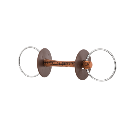 Les mors en cuir sont extrêmement bien acceptés. Le cuir est un produit entièrement naturel qui stimule la mastication et la salivation. Le mors glisse aisément dans la bouche, ce qui augmente la sensation de bien-être de l’animal. Nos produits subissent un tannage végétal et sont cousus à la main. Une fois mouillé, ce mors ergonomique s’adapte parfaitement à l’anatomie de la bouche du cheval. Notre mors en cuir convient particulièrement bien aux jeunes chevaux hypersensibles. En général, même les chevaux complètement réfractaires aux mors acceptent facilement un mors en cuir, ils peuvent ainsi réapprendre la confiance en cet équipement. L’anneau lâche permet une plus grande mobilité du mors dans la bouche. Le mors de filet convient donc aux chevaux qui affectionnent un mors « plus mobile » dans la bouche. L’anneau coulisse de façon très homogène dans les douilles en cuivre. La solidité accrue augmente considérablement la durée de vie du mors. Le choix de l’embouchure permet de répondre mieux encore aux besoins du cheval.